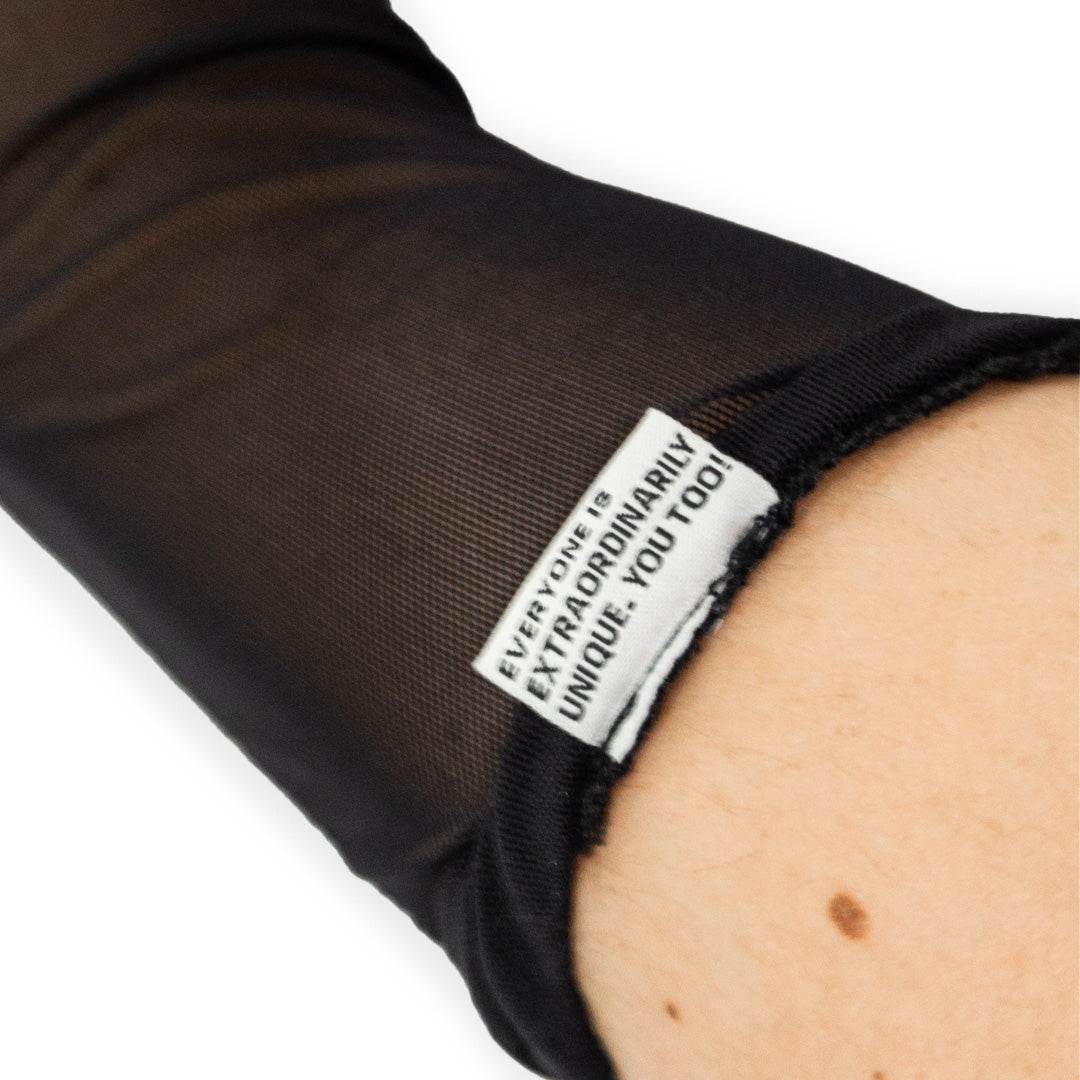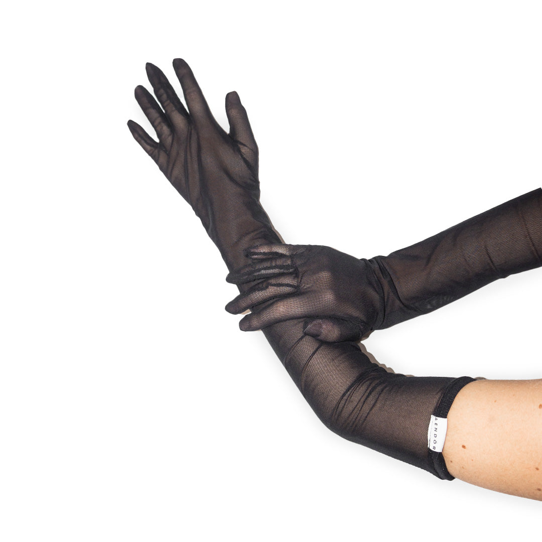 Gloves handmade in Italy in black mesh. Extremely stretchy. Gloves reach above the elbows (approx. 56 cm) and keep standing thanks to the elastic band. Logo Aendör Studio at the front label and claim on the back "Everyone is extraordinarily unique. You too!"