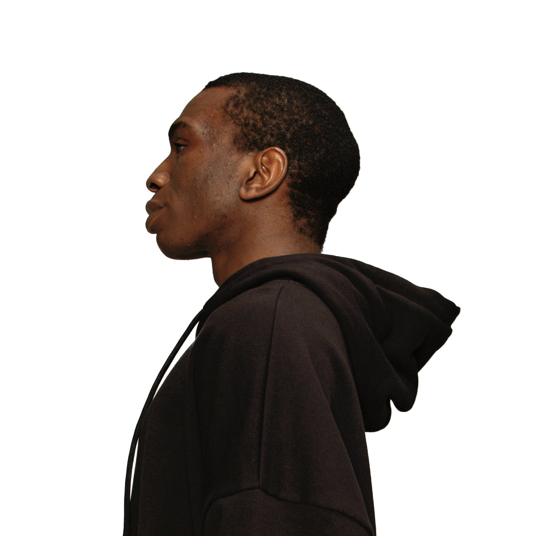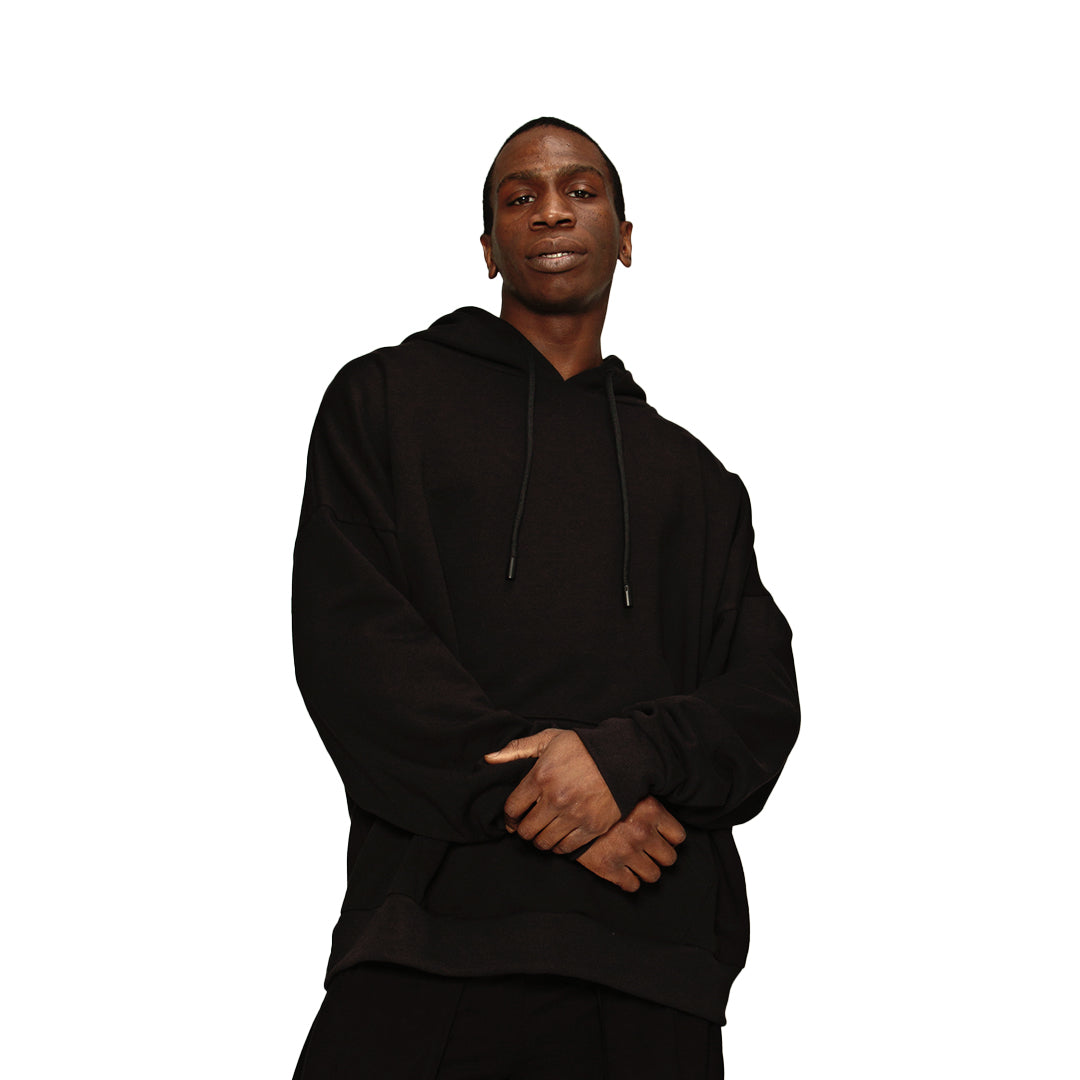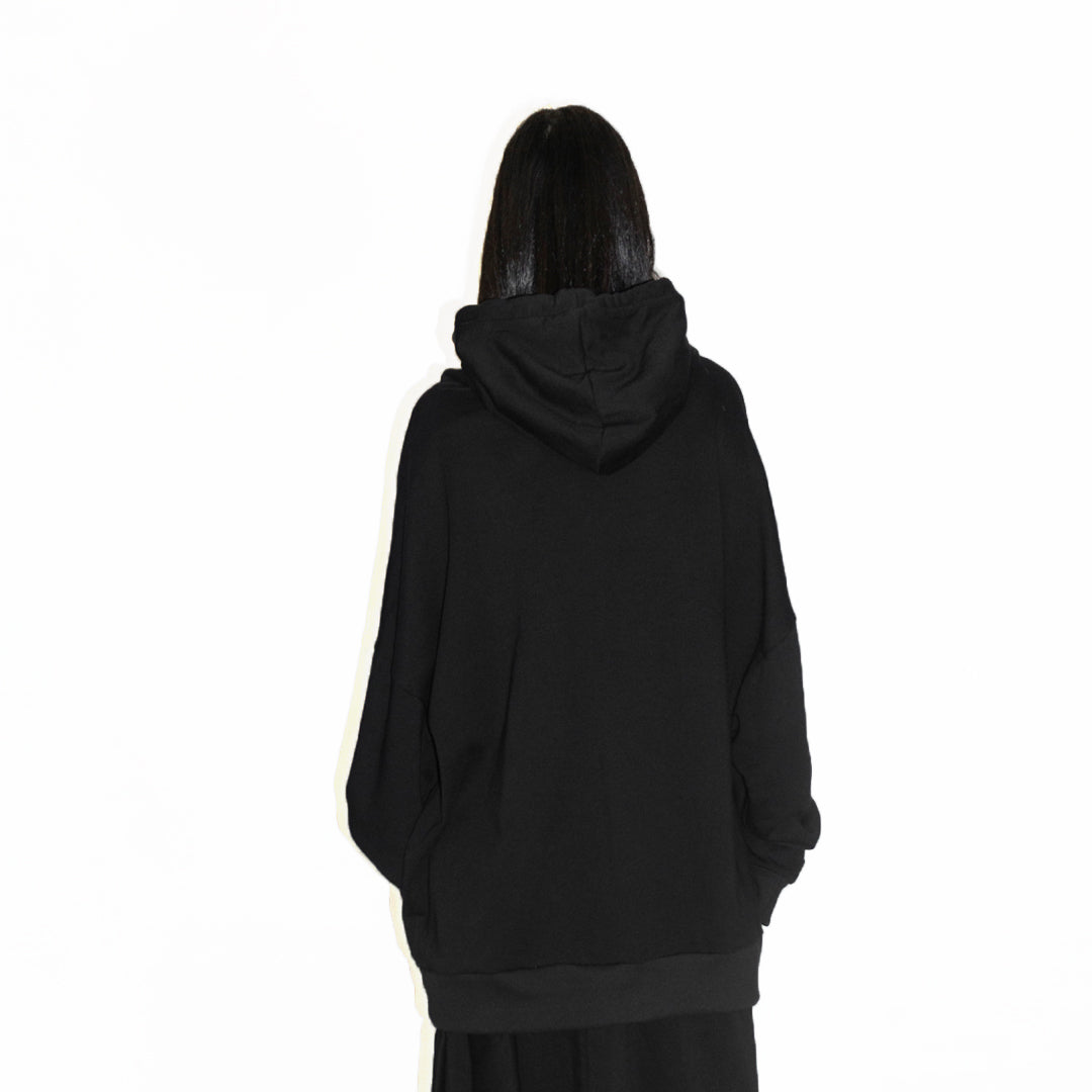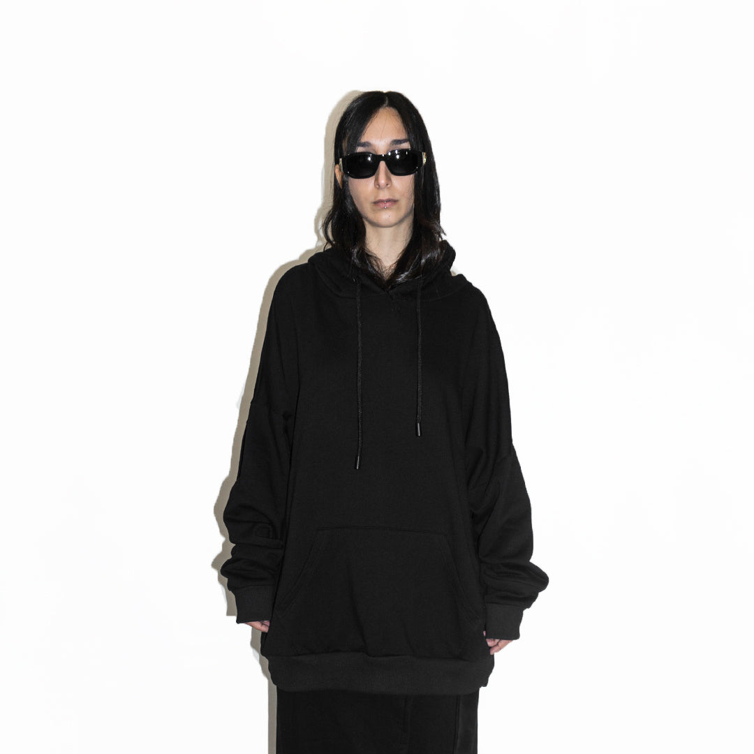 Oversize hoodie handmade in Italy in Organic Cotton in black Organic Cotton. Oversize/loose fit. Large sleeves whit slightly dropped shoulders. One kangaroo pocket at front.