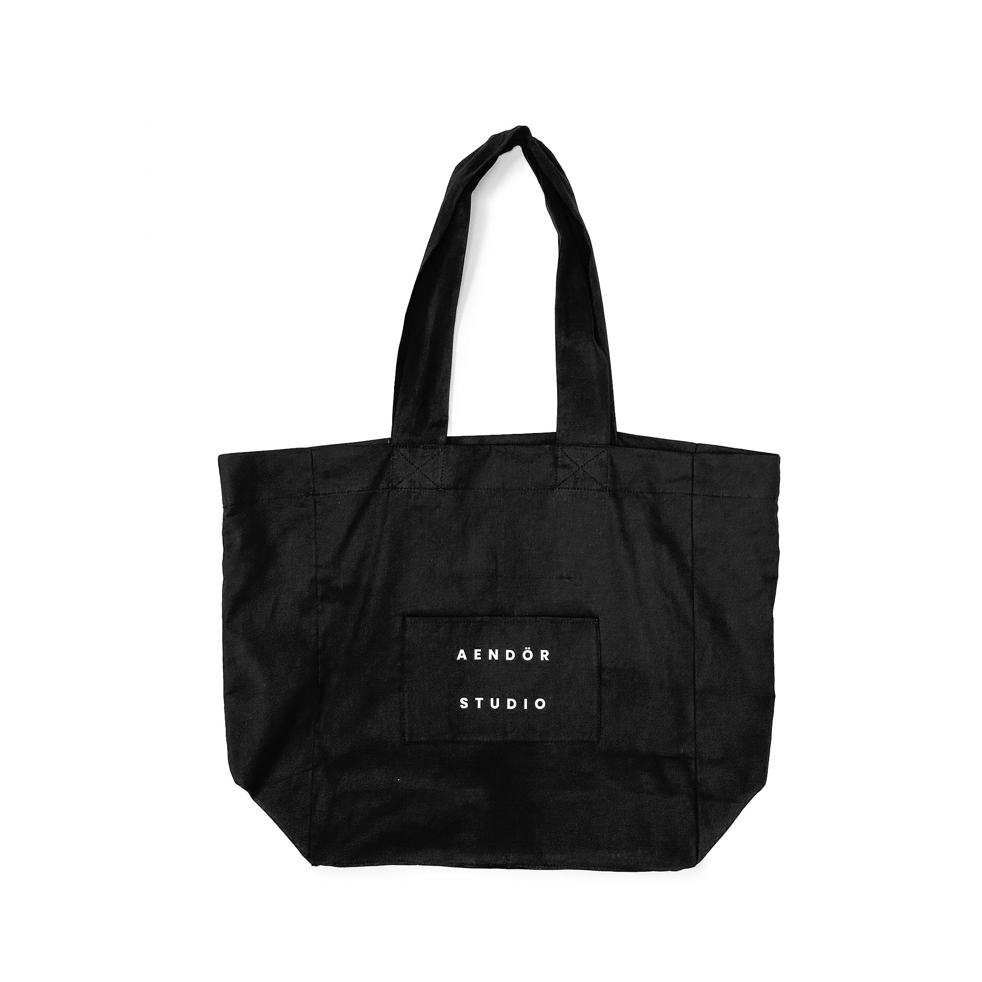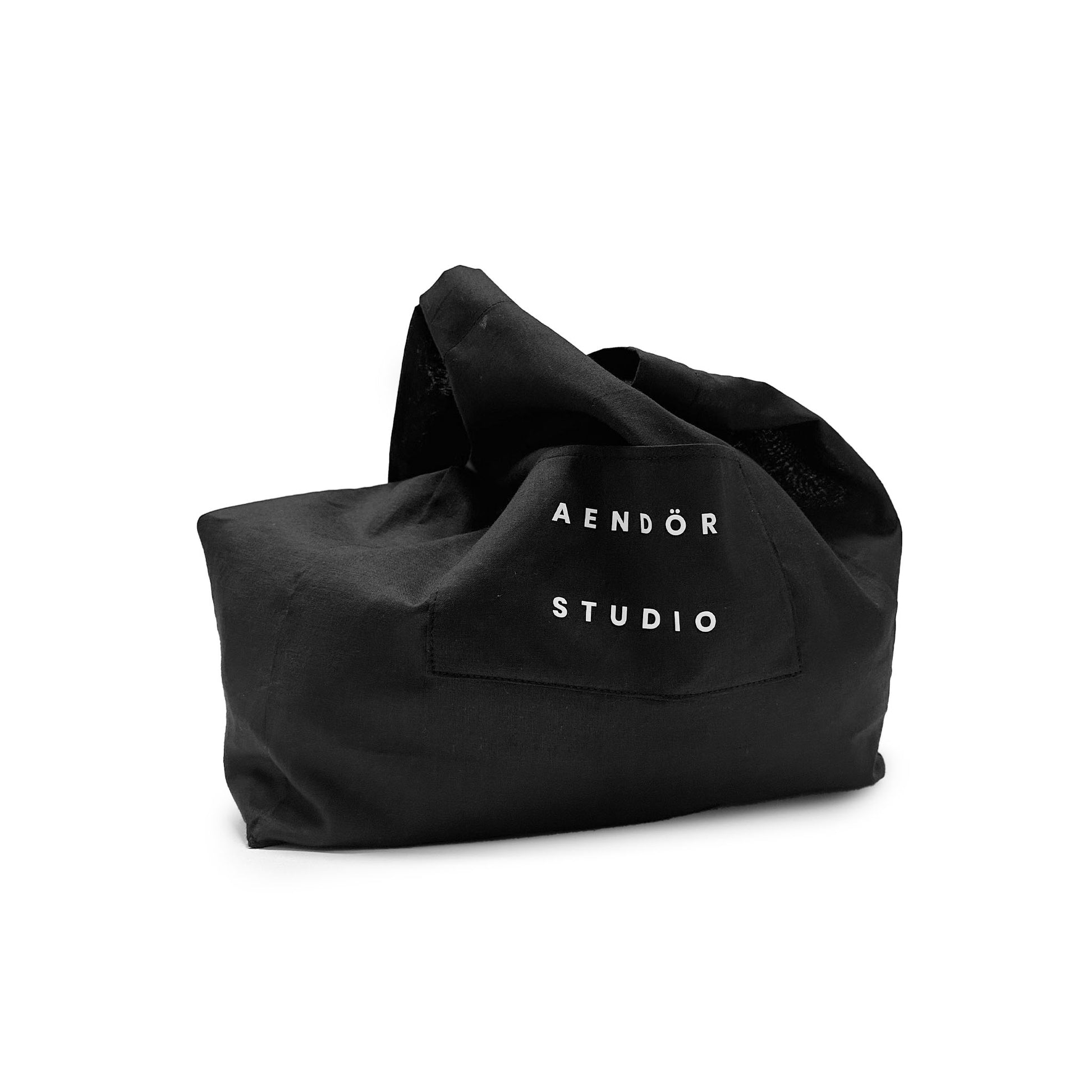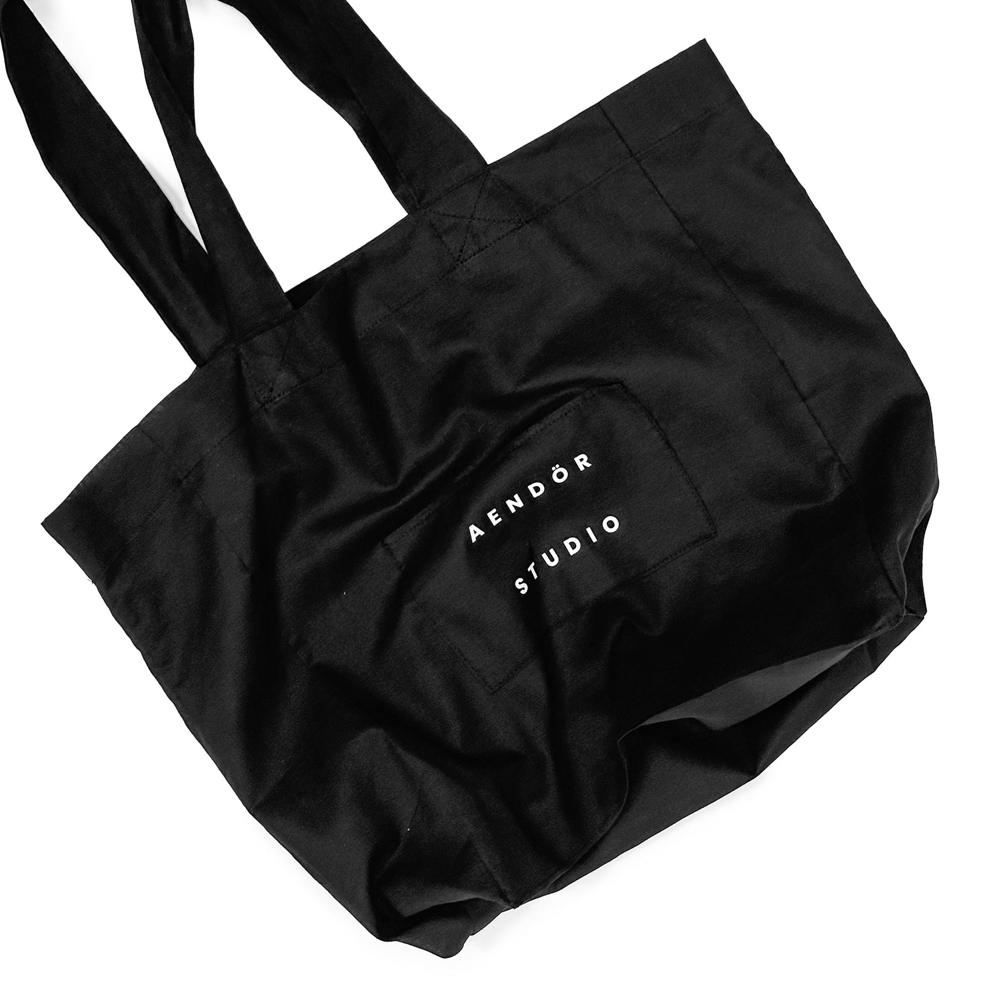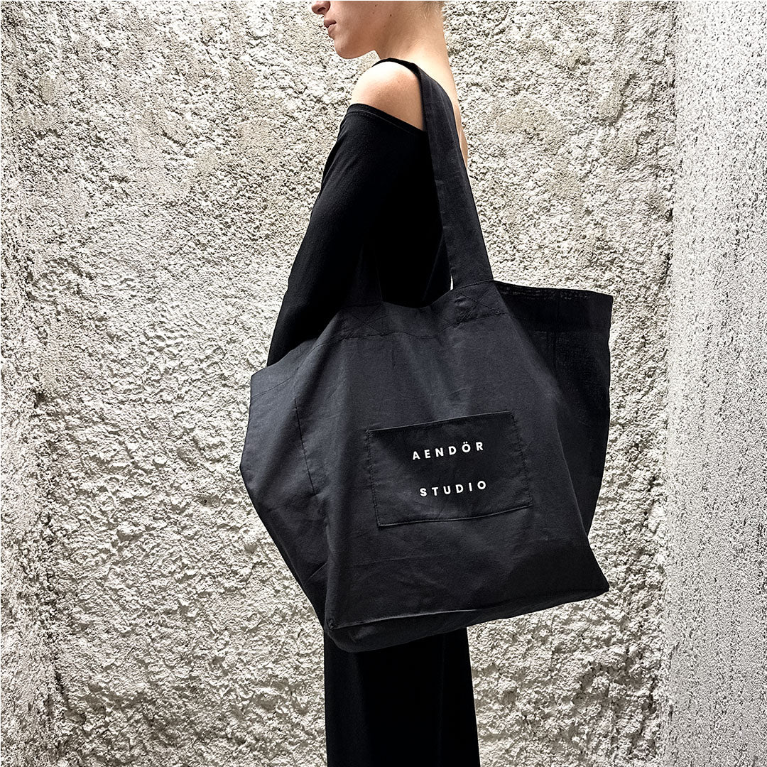 Borsa larga in cotone 100% fatta a mano in Italia. Taschino esterno porta-oggetti con logo Aendör Studio. stampato.