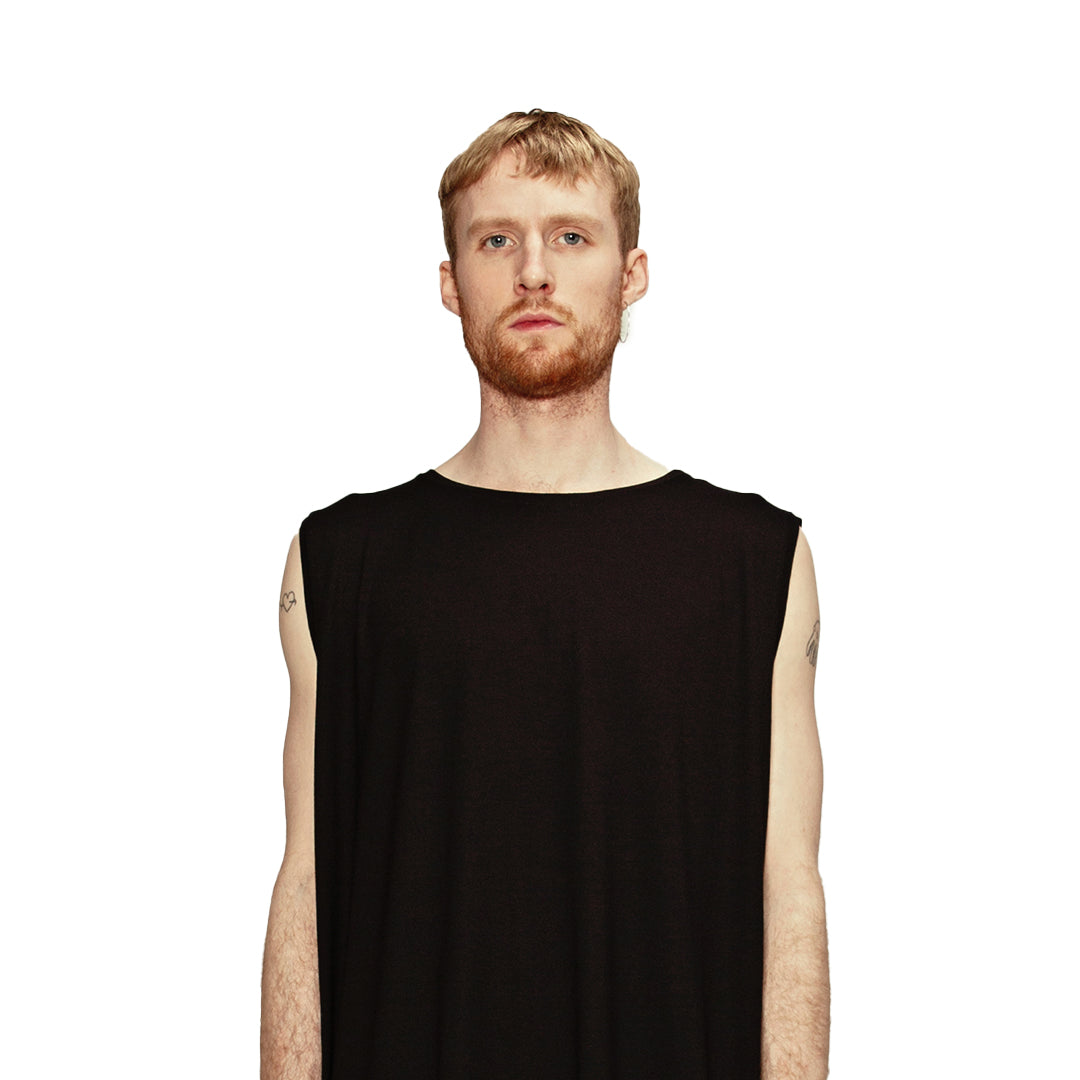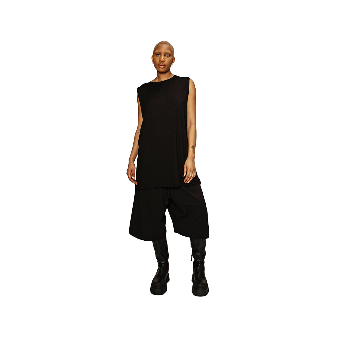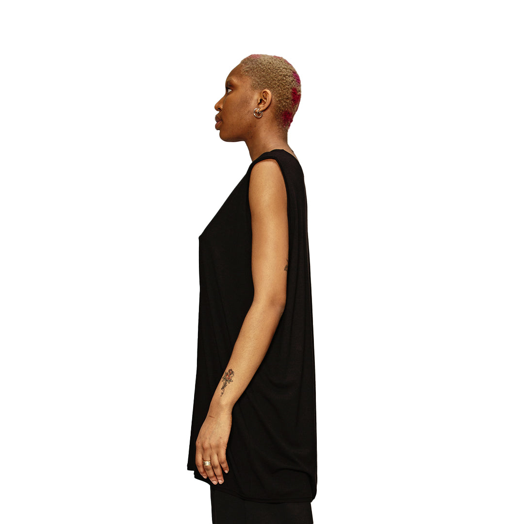 Tank Top Oversize fatto a mano in italia in soft jersey nero. Vestibilità oversize, smanicato con largo giromanica. Può essere usato come abito.