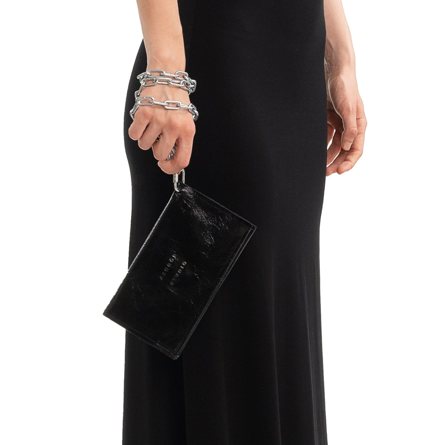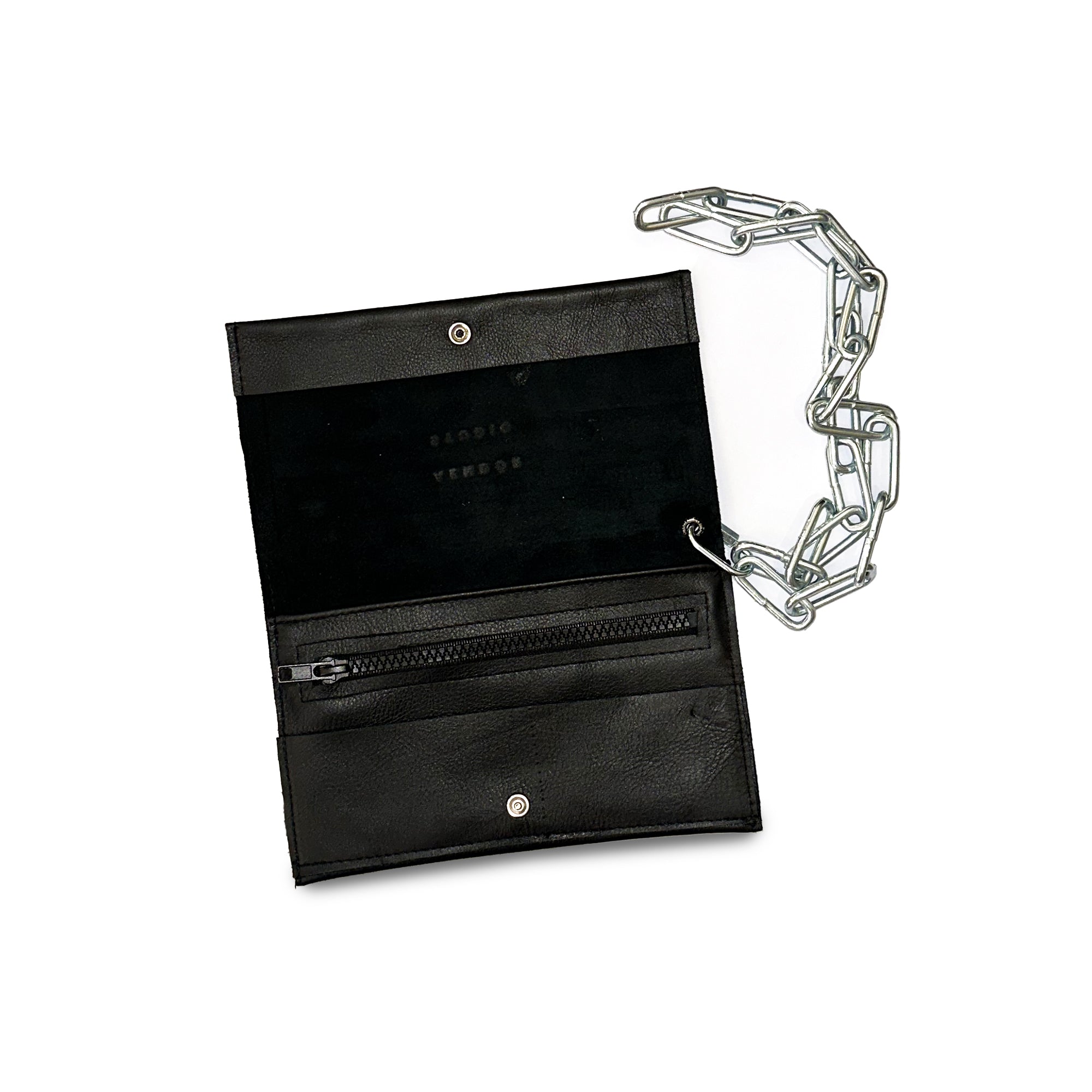 Porta tabacco realizzato a mano in pelle di vitello nera. Manico a catena. Una tasca per il tabacco, una tasca con zip per tutto l'essenziale e due piccole tasche per accendino e cartine. Chiusura a clip singola. Realizzato a mano in Italia.