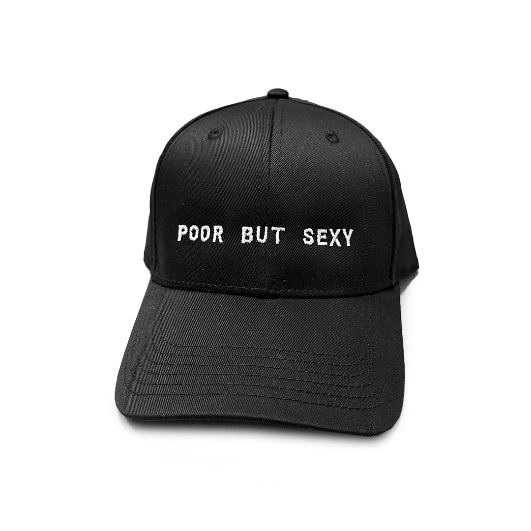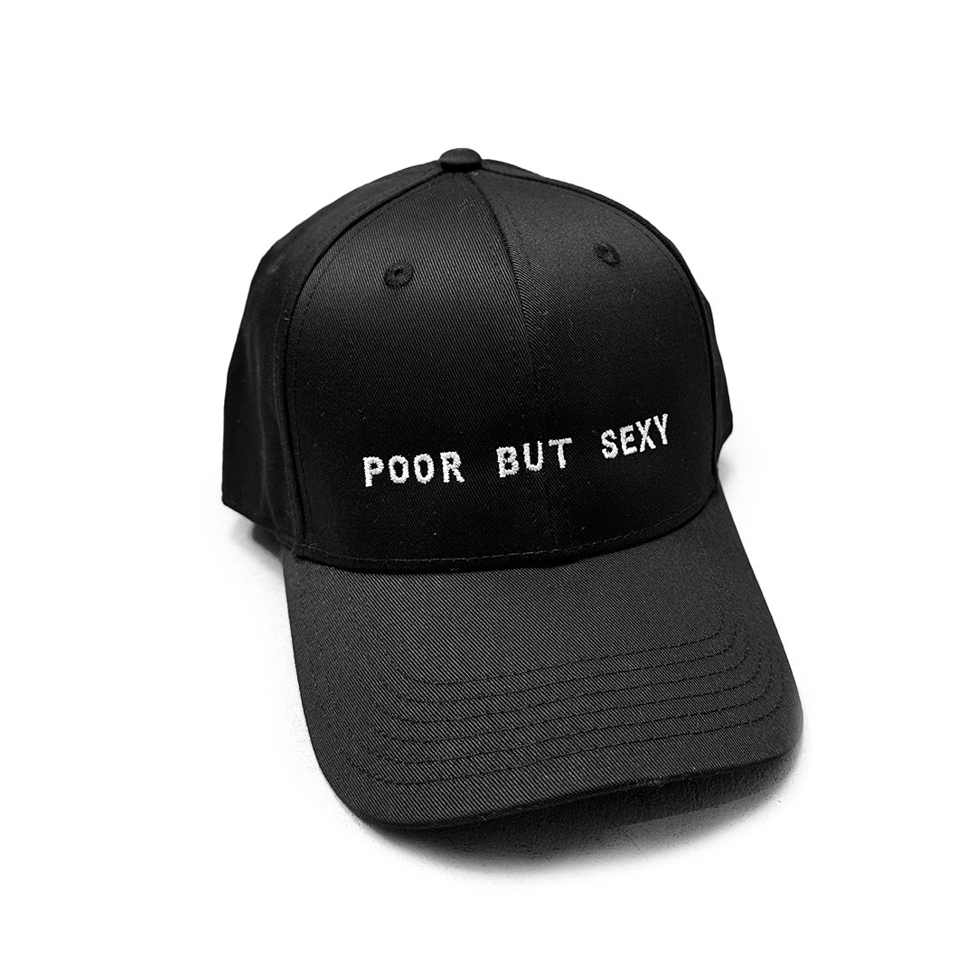 Cappello in cotone e poliestere con cappuccio a 5 pannelli e ricamo POVERO MA SEXY. Visiera preformata e occhielli di ventilazione per proteggerti dai raggi UV senza soffrire di sudorazione eccessiva. Taglia regolabile con velcro o clip in metallo.